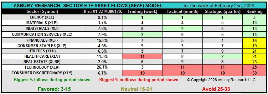 In the SEAF Model Graphic below, the Ranking column sorts the entire table of 11 sector ETFs according to the sum of rankings in the Trading (weekly), Tactical (monthly), and Strategic (quarterly) categories, from largest inflows to largest outflows. The premise of the model is to invest in the sectors where the money is going and to avoid the sectors where the money is coming out.
