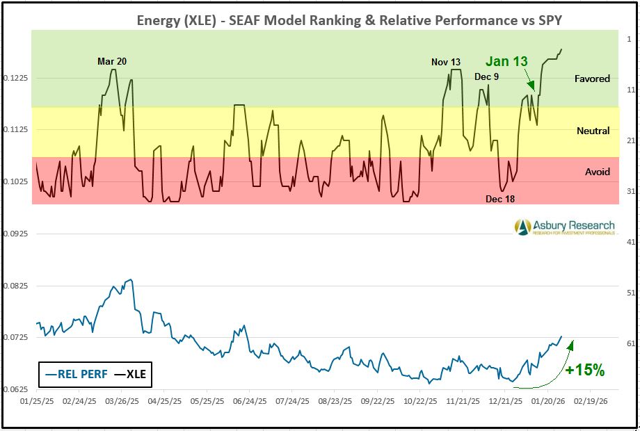 This week, economically sensitive Energy (XLE) retains its top-three SEAF Model status for the third consecutive week and is joined by cyclical Materials, which has maintained it current Favored status since Jan 5th, and economically sensitive Industrials, which has been one of the top-three ranked sectors for nine of the past ten weeks. These three sectors typically outperform in a cyclical, inflation-aware, growth-accelerating economic environment. At the other end of the spectrum, Consumer Discretionary and Technology are currently the two worst-ranked sectors.
