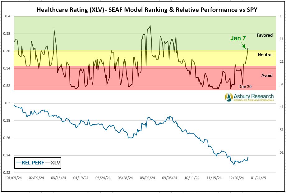Defensive Health Care (XLV) is the SEAF Model’s fourth best-ranked sector this week with a Ranking score of 13. The green highlights in Chart 3 below show that Health Care edged into a Favored Ranking on Jan 7th for the first time since mid-September 2024. We view this as a potential indication that, following a 23.3% advance in the benchmark S&P 500 (SPX) during 2024, investors may be starting to position themselves for an overdue corrective decline.