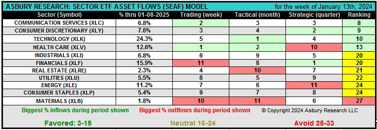 This weekly video by Jack and John Kosar, goes into more detail on the latest SEAF Model data via a heat map that shows where sector-related assets are going, and where they are leaving, in the 11 Sector SPDR ETFs, and also dissects our SEAF “Rainbow Charts” which display the past 12 months of Favored, Neutral, or Avoid rankings in several key market sectors.