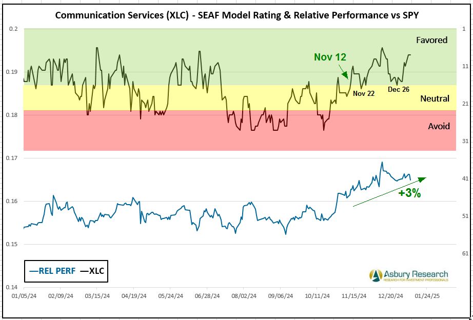 Economically sensitive Communication Services (XLC) is again the SEAF Model’s top-ranked sector this week with a Ranking score of 10. The green highlights in the upper panel show that XLC initially moved into Favored status on Nov 12th and, despite tests of this ranking on Nov 22nd and Dec 26th, has remained Favored since. The lower panel shows that XLC has coincidentally outperformed the benchmark S&P 500 (SPY) by 3% as these relatively aggressive asset inflows have driven the price of the ETF higher.