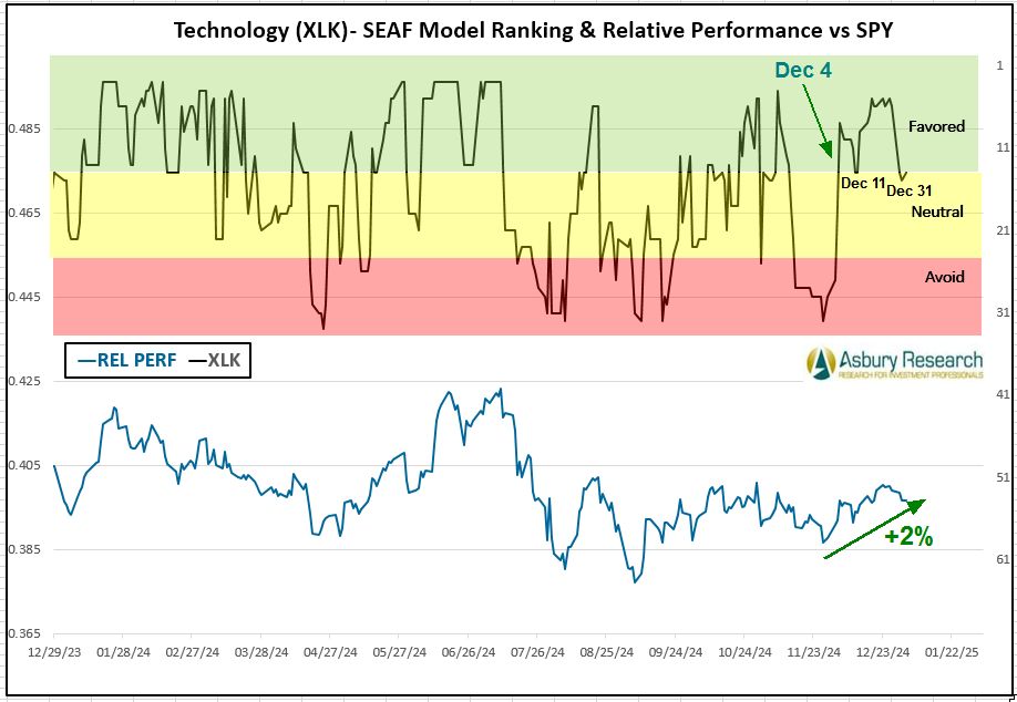 Economically sensitive Technology (XLK) is the SEAF Model’s second-best-ranked sector this week with a Ranking score of 14. The green highlights show that Technology initially moved into Favored status on Dec 4th (upper panel) while XLK has coincidentally outperformed the benchmark S&P 500 (SPY) by 1%. Technology has recently tested and held a Dec 31st test of the lower edge of its Favored status, which we viewed as a Tactical decision point for the sector. As long as Technology retains its current Favored status, it will suggest a bet by investors that – despite the current broad market correction — Technology/AI will continue to outperform.