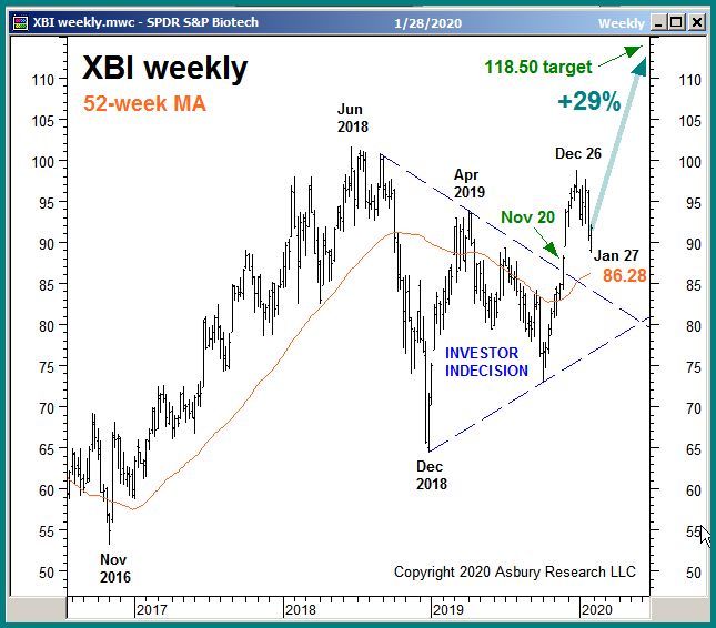 Chart 1 below plots XBI weekly since mid 2016. The green highlights show that, following an initial late November breakout higher from 18 months of sideways investor indecision, XBI has recently corrected lower. Our tactical market tools now indicate favorable conditions for that initial November rise to resume. A sustained rise from this week’s lows would help confirm this and target an eventual, additional 29% rise to 118.50.