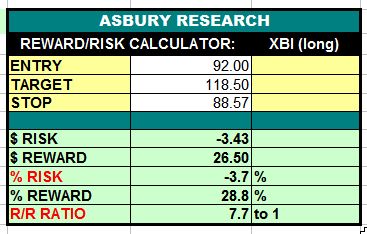 The SPDR S&P Biotech ETF (XBI) is amid favorable conditions to resume its November 2019 advance. A sustained rise above this week’s lows would help confirm this and target an additional 29% rise to $118.50 area. This is an Asbury Momentum idea.