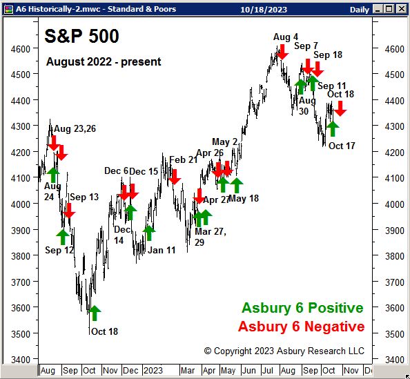 A: The Asbury 6 is a combination of six diverse market metrics that we have combined as a tool to look beyond the day-to-day, up-and-down noise of the stock market to determine its actual health — in much the same way as a doctor first checks the patient’s vital signs during an office visit. We view the A6 as a lie detector test for the market. It helps us to identify real, sustainable market advances or declines from computer-driven traps for investors — the latter which we believe are often generated by algorithmic (computer) trading which now comprises about 80% of daily trading volume.