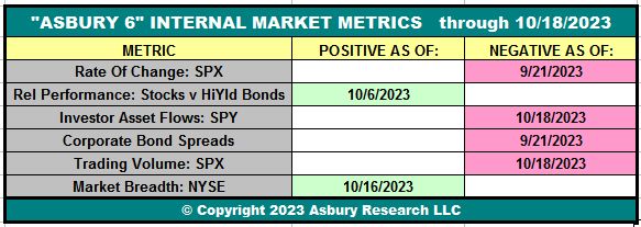 Table 1 below shows that as of the close on October 18th, 4 of the Asbury 6 constituent metrics have shifted back to negative (red). This changes the “A6” Model itself to a Negative status, from Positive on October 17th, as four or more metrics in one direction indicate a directional bias.
