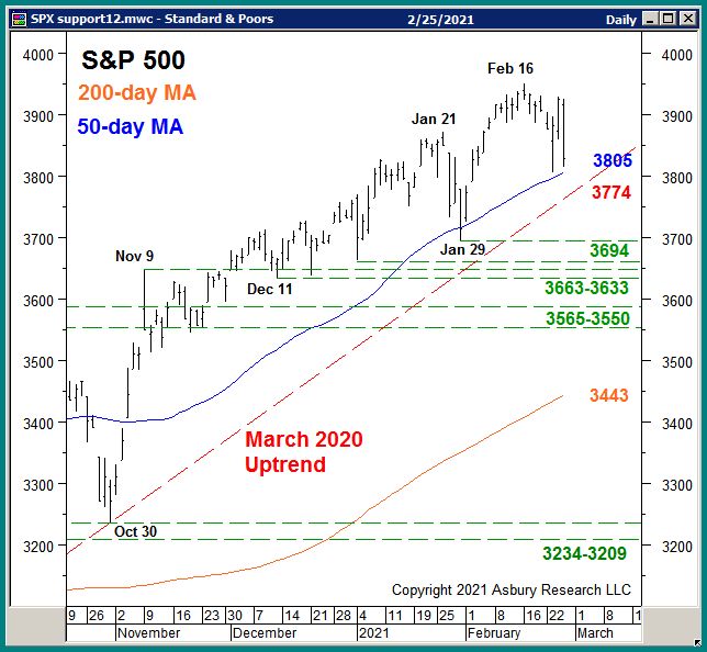 When these Tactical decision points becoming apparent, we attach them to an underlying support level on the benchmark S&P 500 (SPX) chart. Chart 1 below shows that, in this instance, that support level is at 3805 to 3774. It represents the 50-day moving average (solid blue line) and the March 2020 uptrend (dashed red) line, and it is currently being tested.
