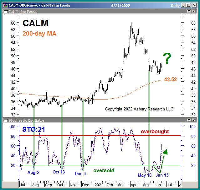 The upper panel of Chart 1 below plots CALM daily over the past year along with its 200-day moving average, a widely-watched major trend proxy currently at $45.42 which the stock has recently tested as major underlying support and is currently rising from. The lower panel plots monthly overbought/oversold conditions according to the 21-day (monthly) Stochastic oscillator. The green highlights show that CALM is currently rising out of monthly oversold extremes, and that previous instances of this coincided with Tactical bottoms on Dec 3rd, Oct 13th, and Aug 5th, 2021.