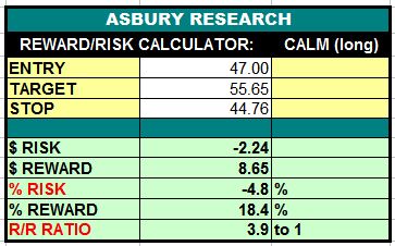 Consumer Staples stock Cal-Maine Foods (CALM) is currently testing major underlying support near $42.52 amid monthly oversold conditions, setting up a potential low risk buying opportunity. A sustained rise above the $44.76 area would target an 18% rise to $55.65. This is an Asbury Value idea.