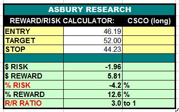 Cisco Systems, Inc. (CSCO) appears to be resuming its November 2020 major uptrend amid quarterly relative performance versus the benchmark S&P 500 (SPX). A sustained rise above the $44.23 area would help confirm to this and target an additional 13% rise to $52.00 per share. This is an Asbury Momentum trade idea.