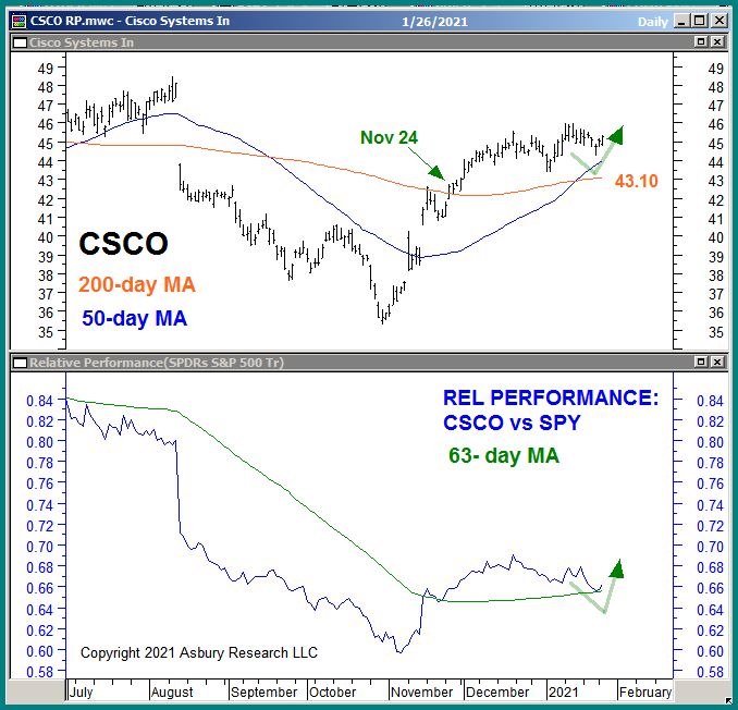 The upper panel of Chart 1 below plots CSCO daily since July 2020 along with its 200- and 50-day moving averages, widely-watched major and minor trend proxies. The lower panel displays a corresponding daily relative performance chart of CSCO versus the benchmark S&P 500 (SPX, blue) along with its 63-day moving average (green, quarterly, our Strategic time period).