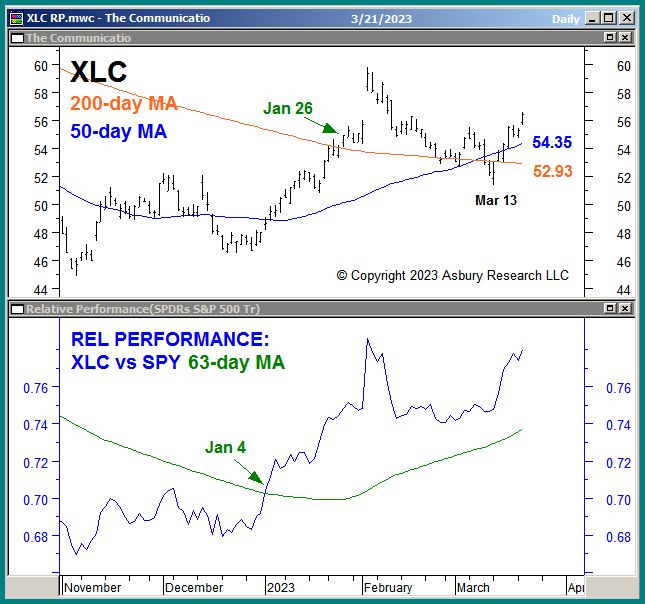 The upper panel shows that XLC rose above its 200-day moving average on Jan 26th to indicate an emerging major bullish trend change, and that this trend was recently re-tested and held on Mar 13th. Also note that the 50-day MA has recently crossed above the 200-day MA to indicate a positive intermediate-term shift in price momentum. Major support exists at 52.93, the current location of the 200-day MA.