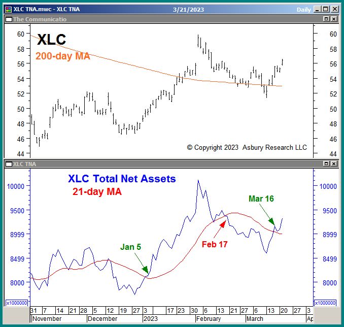 The lower panel of Chart 2 below plots the daily total net assets invested in XLC since November 2022 along with their 21-day moving average, which we use to identify a monthly trend of expansion or contraction.