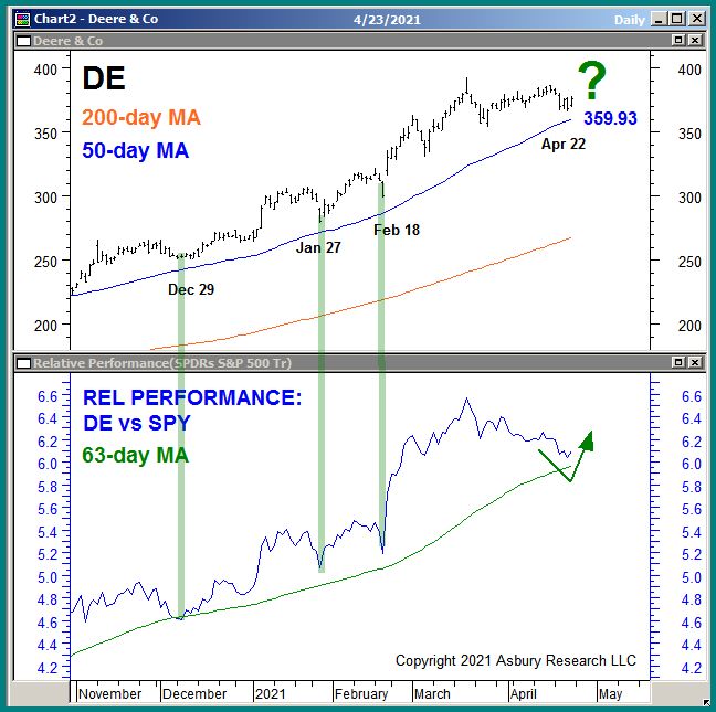 The upper panel of Chart 1 below plots DE daily since November 2020 along with its 200- and 50-day moving averages, widely-watched major and minor trend proxies. The lower panel displays a corresponding daily relative performance chart of DE versus the benchmark S&P 500 (SPX, blue) along with its 63-day moving average (green, quarterly, our Strategic time period).