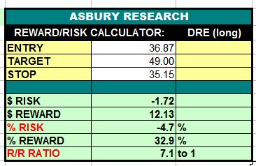 Chart 1 below plots DRE daily since late 2018 and shows that price is currently breaking out higher from about 4 months of sideways investor indecision from the February highs. A sustained rise above the upper boundary of the indecision area, currently near $35.91, would target an eventual, additional 33% rise to $49.00 per share.