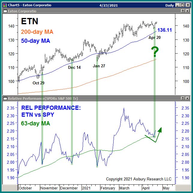 The upper panel of Chart 1 below plots ETN daily since October 2020 along with its 200- and 50-day moving averages, widely-watched major and minor trend proxies. The lower panel displays a corresponding daily relative performance chart of ETN versus the benchmark S&P 500 (SPX, blue) along with its 63-day moving average (green, quarterly, our Strategic time period).
