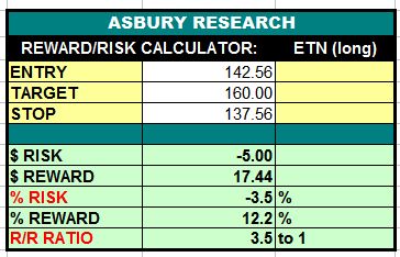 Table 1 below shows that considering the aforementioned upside target and a protective stop placed below the $137.56 area, a long entry price of $142.56 would provide a 1:3.5 risk/reward ratio (risking $1.00 to make $3.50) with an initial risk of 3.5%.