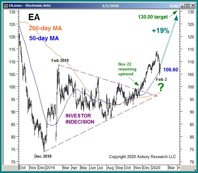 Chart 1 below plots EA daily since late 2018 along with its 200-day and 50-day moving averages, the latter widely-watched major and minor trend proxies. The chart shows that EA is currently rebounding higher from a Feb 3rd test of its 50-day MA at $106.60. This is where the current November 2018 breakout higher from almost a year of sideways investor indecision should resume, IF still valid and intact. A sustained rise above the $106.60 area would help confirm this and target an additional 19% rise to $130.00 per share.