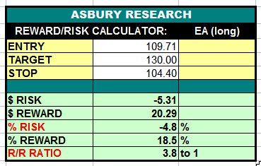 Electronic Arts (EA) is amid favorable conditions to resume its November 2018 breakout from a year of sideways investor indecision. A sustained rise above the $106.60 area would help confirm this and target an additional 19% rise to $130.00 per share. This is an Asbury Momentum idea.