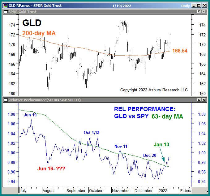 The green highlights in the lower panel point out that GLD began a new trend of Strategic relative outperformance versus SPY on Jan 13th. The upper panel shows that GLD also recently began trading above its 200-day MA to suggest an emerging major bullish trend.