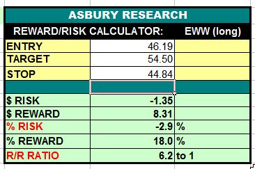 Am emerging major bottom in the iShares MSCI Mexico Capped ETF (EWW) targets an additional 18% rise to 54.50 that will remain valid above the 44.84 area. This is an Asbury Momentum idea.