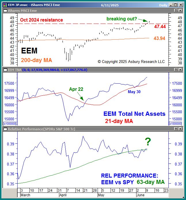 The green highlights in the upper panel of Chart 1 below show that the iShares MSCI Emerging Markets ETF (EEM) is breaking out higher from formidable overhead resistance at its 47.44 October 2024 benchmark high. The middle panel shows that the total net assets invested in EEM (AUM) moved above their 21-day moving average on Apr 22nd to indicate a monthly trend of expanding assets characteristic of sustainable bullish Tactical price advances, and that this trend was more recently tested and held on May 30th. The lower panel shows that EEM appears to be in an emerging trend of quarterly relative outperformance versus the benchmark S&P 500 (SPY).