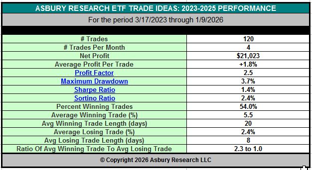 Table 2 below breaks down the 120 individual trade ideas published in real time via our Asbury ETF Trade Ideas from March 17th, 2023, through January 9th, 2026, for a total of 34 months. Our Asbury ETF Trade Ideas are accessible directly from the Research Center, available via the lower-right rectangle at the top of that page.