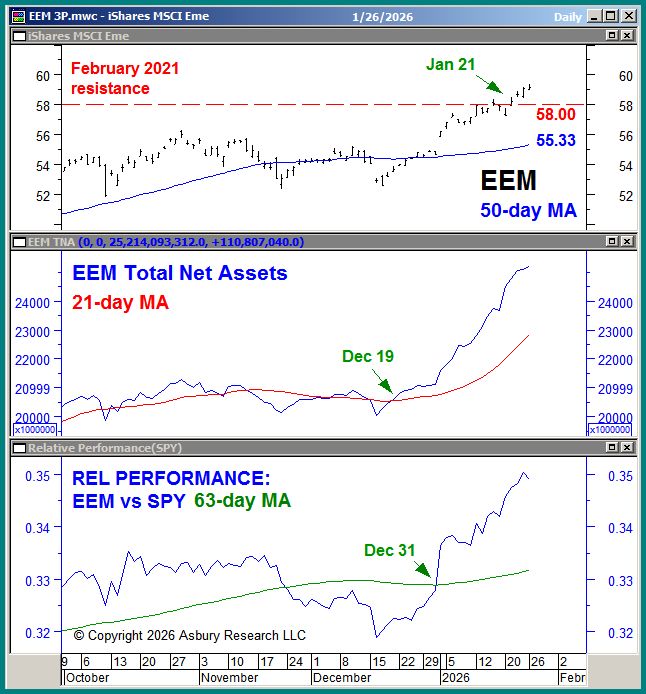 The upper panel of Chart 1 below shows that the iShares MSCI Emerging Markets ETF (EEM) is breaking its 58.00 February 2021 benchmark high to establish new all-time highs. The middle panel shows that the total net assets invested in EEM (AUM) are in a Dec 19th trend of monthly expansion. Expanding assets are characteristic of sustainable price advances. The lower panel shows that EEM is in a Dec 31st trend of quarterly relative outperformance versus the S&P 500 (SPY).