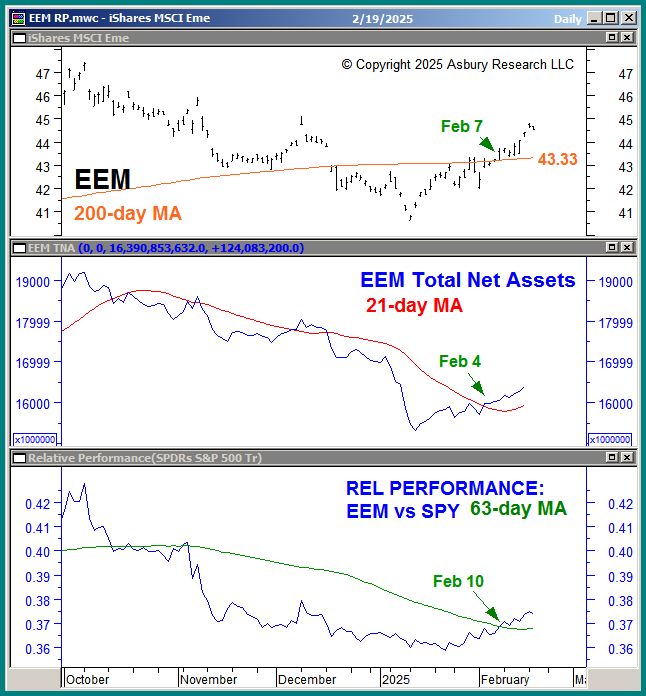 The upper panel of Chart 1 below shows that the iShares MSCI Emerging Markets ETF (EEM) is in the midst of an emerging major uptrend as indicated by its Feb 7th rise above its 200-day moving average, a widely-watched major trend proxy. The middle panel shows that the total net assets invested in EEM (AUM) expanded above their 21-day MA on Feb 4th to indicate a trend of monthly expansion. Expanding assets indicate bullish conviction in higher prices. The lower panel shows that EEM has been outperforming the S&P 500 on a 63-day quarterly basis since Feb 10th to indicate a monthly trend of quarterly relative outperformance.
