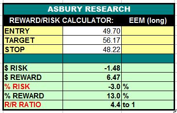 The iShares MSCI Emerging Markets ETF (EEM) is in an emerging trend of outright strength and relative outperformance versus the S&P 500 amid recently expanding investor asset flows. A sustained rise above the 48.95 area would target an additional 13% rise to 56.17. This is an Asbury Value trade idea.