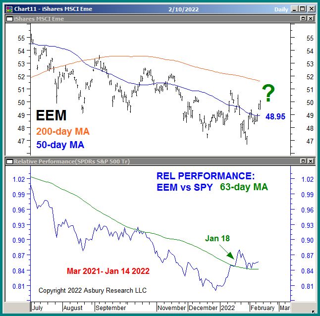 The green highlights in the lower panel point out that EEM began a new trend of Strategic (63-day, quarterly) relative outperformance versus the SPDR S&P 500 ETF Trust (SPY) on Jan 18th, after previously underperforming since March 2021. Meanwhile, the upper panel shows that EEM is edging above its 50-day MA to suggest an emerging minor bullish trend change.