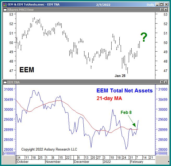 The green highlights in the lower panel point out what appears to be an emerging Feb 8th trend of monthly asset expansion. Expanding investor assets are the fuel that drives a price trend. As long as this trend continues, so should recent strength in EEM.