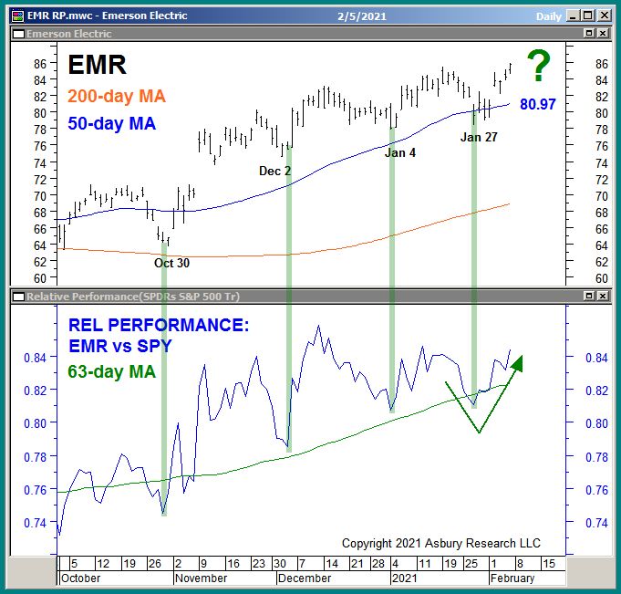 The upper panel of Chart 1 below plots EMR daily since October 2020 along with its 200- and 50-day moving averages, widely-watched major and minor trend proxies. The lower panel displays a corresponding daily relative performance chart of EMR versus the benchmark S&P 500 (SPX, blue) along with its 63-day moving average (green, quarterly, our Strategic time period).