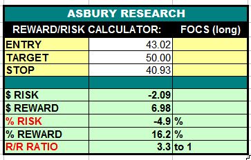 Table 1 below shows that considering the aforementioned upside target and a protective stop placed below the $40.93 area, a long entry price of $43.02 would provide a 1:3.3 risk/reward ratio (risking $1.00 to make $3.30) with an initial risk of 4.9%.