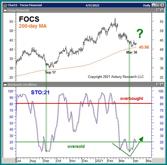 The rightmost green highlights in Chart 1 below show that FOCS is testing major underlying support at its 200-day moving average, currently at $40.96 while hovering at monthly (our Tactical time period) oversold extremes. The other green highlights show that a previous similar oversold extreme in September 2020 helped trigger the resumption of the stock’s October 2020 major uptrend as defined by the 200-day MA and led into a large, sustained advance. These conditions set up a low-risk buying opportunity because, If that major uptrend is still valid, this is where it should resume.