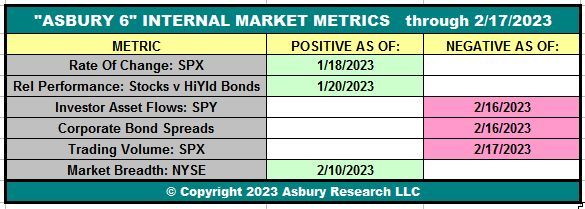 More About The Asbury 6: The Asbury 6, updated daily in our Research Center, is a combination of six diverse market metrics that were combined to look beyond the day-to-day, up-and-down noise of the stock market to determine its real health — in much the same way as a doctor checks the patient’s vital signs during an office visit. The “A6” helps us to identify real, sustainable market advances or declines from computer-driven traps for investors. Four or more metrics in one direction indicate a Tactical bias. The dates in each cell indicate when each individual constituent turned either positive (green) or negative (red). When all Asbury 6 are positive, market internals are the most conducive to adding equities exposure to portfolios.