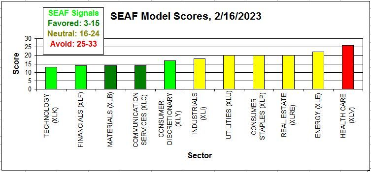 The next graphic shows the latest ranking of the sectors of the S&P 500 according to investor asset flows, based on our SEAF (Sector ETF Asset Flows) Model. The SEAF Model was created to quantitatively identify long/overweight opportunities in US market sectors. SEAF does this by “following the money” as it tracks the investor assets moving around the 11 Select Sector SPDR ETFs, which together comprise the S&P 500.