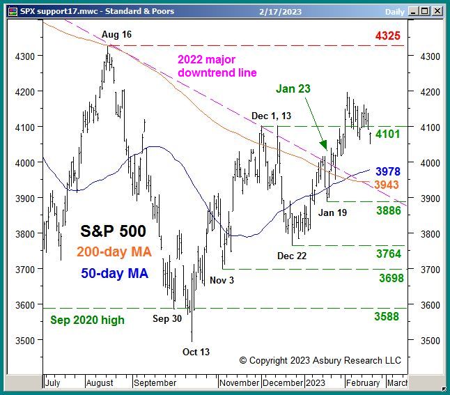 The chart below shows that the benchmark S&P 500 (SPX) made a major bullish trend change on January 23rd by rising and remaining above major resistance at its 200-day moving average and its January 2022 major downtrend line. The chart also shows that this rally has stalled at the 4100 area, which represents the December highs.