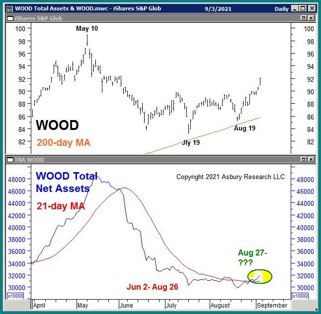 The upper panel of Chart 2 below also plots WOOD daily since April along with its 200-day MA, but this time with the total net assets invested in WOOD and their 21-day MA in the lower panel.