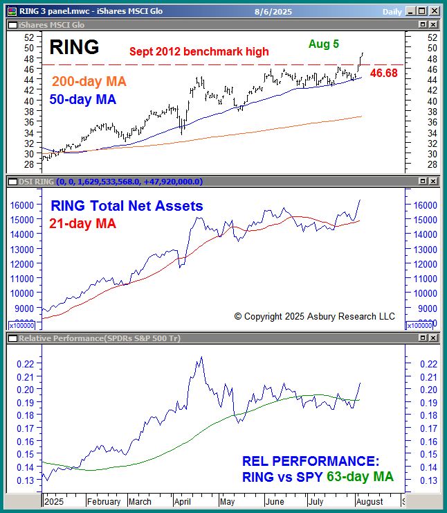 The green highlights in the upper panel of Chart 1 below show that the iShares MSCI Global Gold Miners ETF (RING) is breaking major long-term overhead resistance at 46.68, its September 2012 benchmark high. The middle panel shows that the total net assets invested in RING (AUM) have been in a monthly trend of expansion since January and have now expanded to fresh highs. Expanding assets are characteristic of sustainable price advances. The lower panel shows that RING is in an emerging trend of quarterly relative outperformance versus the benchmark S&P 500 (SPY).