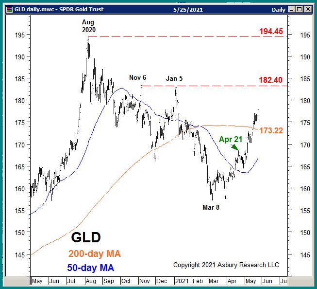 Chart 3 below plots GLD daily over the past year along with its 50- and 200-day MAs. The red highlights show that the next significant level of overhead resistance is an additional 3% above the market at 182.40 and represents the January and November 2020 benchmark highs. Above there, the final level of overhead resistance is the August 2020 all-time high of 194.45, currently 9% above the market.