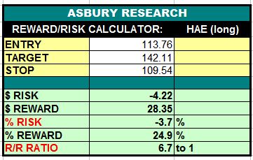 The rightmost green highlights in Chart 1 below show that HAE is testing major underlying support at its 200-day moving average, currently at $105.19 while hovering at monthly (our Tactical time period) oversold extremes. The other green highlights show that previous similar oversold extremes on Jan 28th, and in September and August 2020, helped trigger the resumption of the stock’s October 2020 major uptrend as defined by the 200-day MA. This sets up a low-risk buying opportunity because, If that major uptrend is still valid, this is where it should resume.