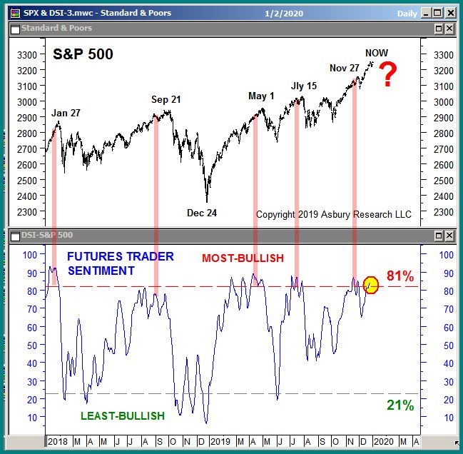 Chart 5 below shows that a survey of near to intermediate term oriented individual futures traders is hovering at multi-year most bullish extreme on the S&P 500 that, as a contrary indicator, has previously coincided with or closely led every significant peak and subsequent multi-month decline in the broad market index since 2018.