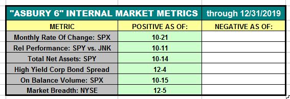 Table 1 below shows that all Asbury 6 key market internals finished 2019 in Positive (bullish) territory, after initially turning to a Positive bias on October 15th.