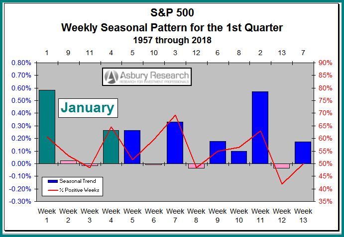 The pink highlights show that the second and third weeks of January are the 5th and 3rd seasonally weakest of the entire 1st Quarter.