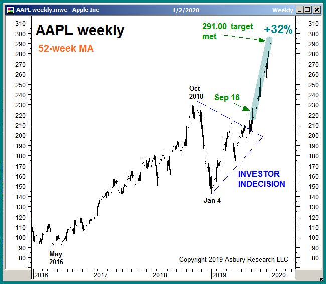 Editor’s Note: This recently-met price target in AAPL is a good example of the many investment ideas we provide, in addition to those that appear in the top section of the table in the Stock and ETF Ideas page of the Research Center. To clarify, in the top section of this table, Asbury Research uses a quantitative, repeatable, multi-step process to identify trending stocks with favorable market internals, low initial risk, and exceptional risk/reward ratios by scanning over 6,000 US stocks and about 200 ETFs after the market close every business day. Of those identified by our scans, we only consider the ones 1) with a market capitalization greater than $2 billion, 2) with an initial risk of 5% or less, and 3) with a risk/reward ratio of 1:3 or greater. However, we also provide a constant stream of price targets for many more stocks and ETFs, like those that appear every week in Table 2 of our Keys To This Week for US Stock Market Sectors & Industry Groups, as well as for global stock indexes as they appear in the middle section of our Asbury Research Trade Ideas table. The difference is, in the latter, these ideas provide price targets but do not meet our strict risk/reward parameters, so investors are advised to implement their own parameters as they pertain to their own risk appetite and financial condition.