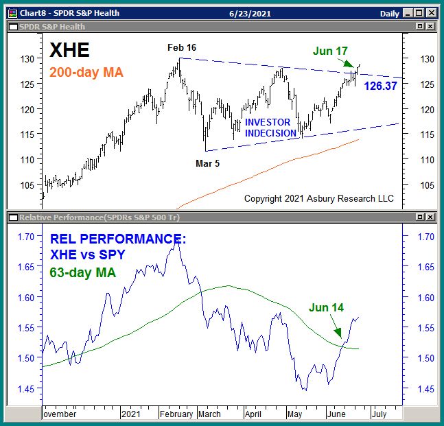 The green highlights in the lower panel show that the blue daily relative performance line between XHE and the SPDR S&P 500 ETF (SPY) moved back above its 62-day moving average on Jun 14th, indicating a new quarterly (our Strategic time frame) of relative outperformance. XHE has already outperformed SPY by 7% since Jun 2nd.