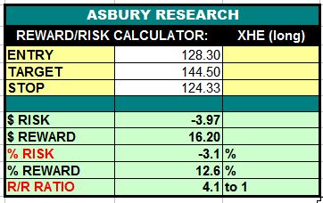 SPDR S&P Health Care Equipment ETF (XHE) is resuming its May 2020 Strategic advance amid coincident relative outperformance versus the S&P 500 (SPY), this following 4 months of sideways indecision. A sustained rise above the 126.37 area would confirm this and target an additional 13% rise to $144.50 per share. This is an Asbury Momentum trade idea.