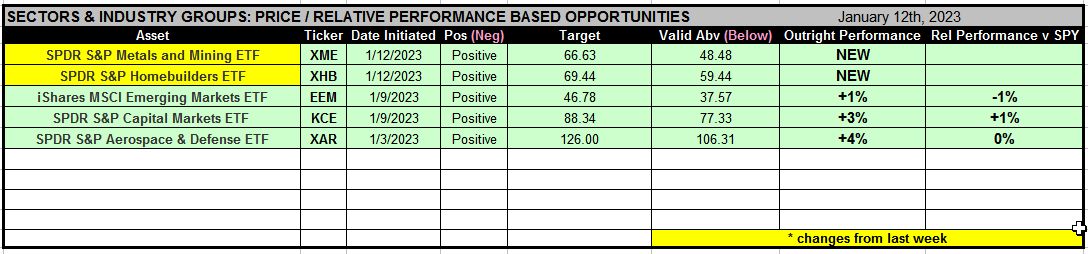 The SPDR S&P Homebuilders ETF (XHB) and SPDR S&P Metals & Mining ETF (XME) are amid favorable conditions according to price, relative performance versus the S&P 500 (SPX), and investor asset flows, for upcoming outright strength and relative outperformance.