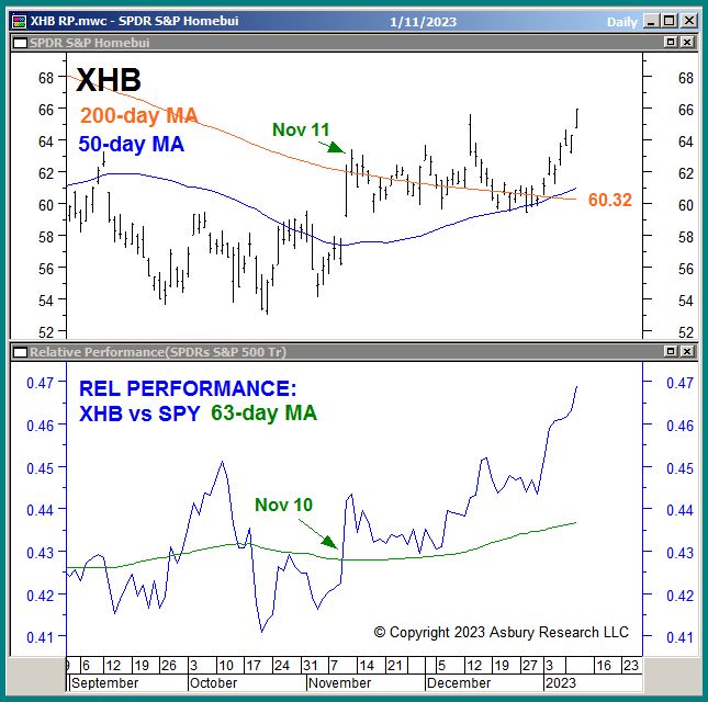 The upper panel shows that XHB has been edging above its 200-day MA since Nov 11th and has moved significantly above it over the past seven days, indicating an emerging major bullish trend change. Also note that the 50-day MA has very recently crossed above the 200-day MA, indicating a major bullish shift in price momentum. The lower panel shows that XHB has been outperforming SPY on a Strategic basis since Nov 10th and that this trend has significantly accelerated since mid-December. Not shown is that the total net assets invested in XHB have begun a new trend of monthly expansion since Jan 5th. Expanding assets indicate investor conviction in higher prices. Combined, these factors suggest a new buy/overweight opportunity in XHB that will remain valid above the 59.44 area.
